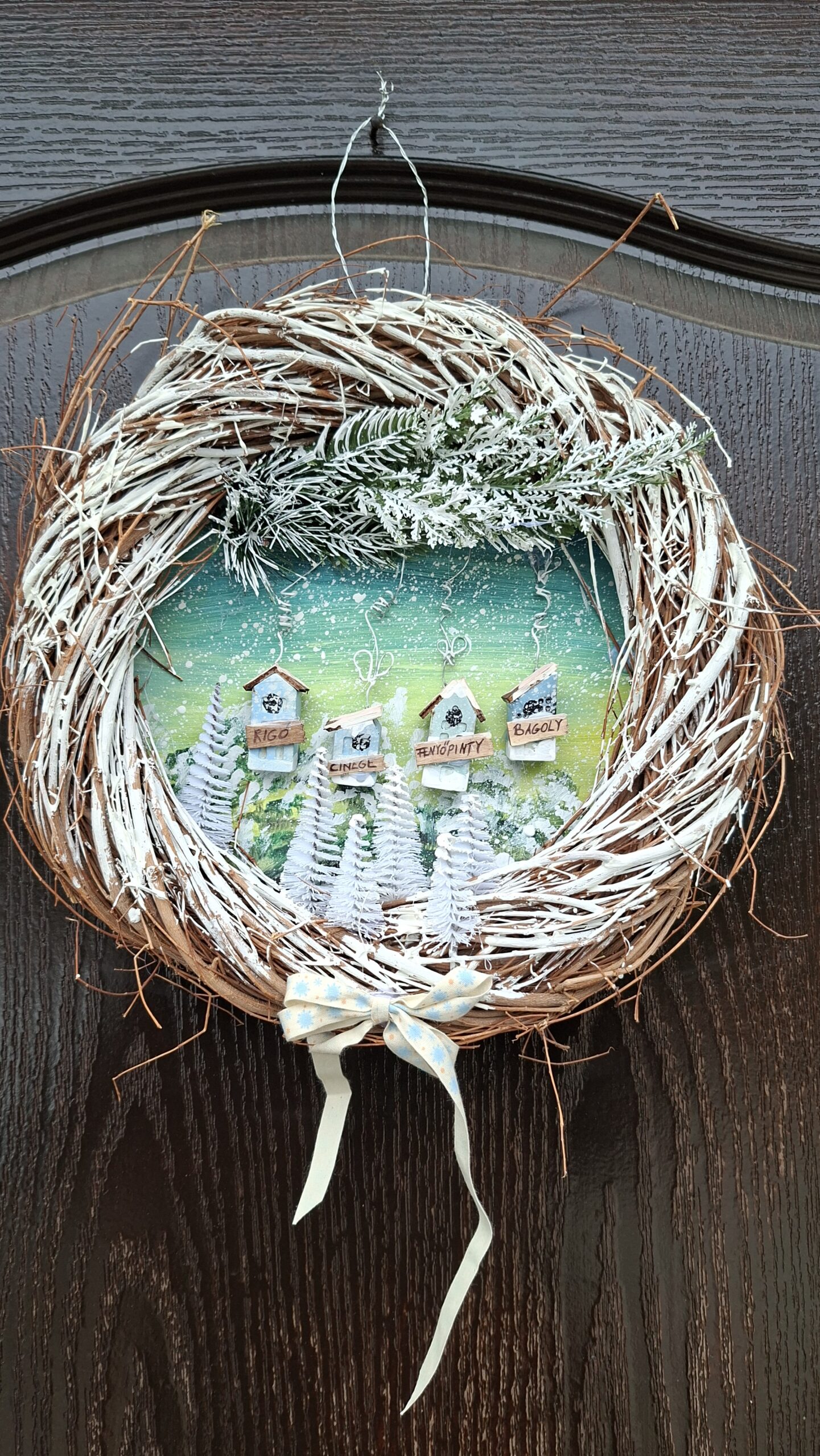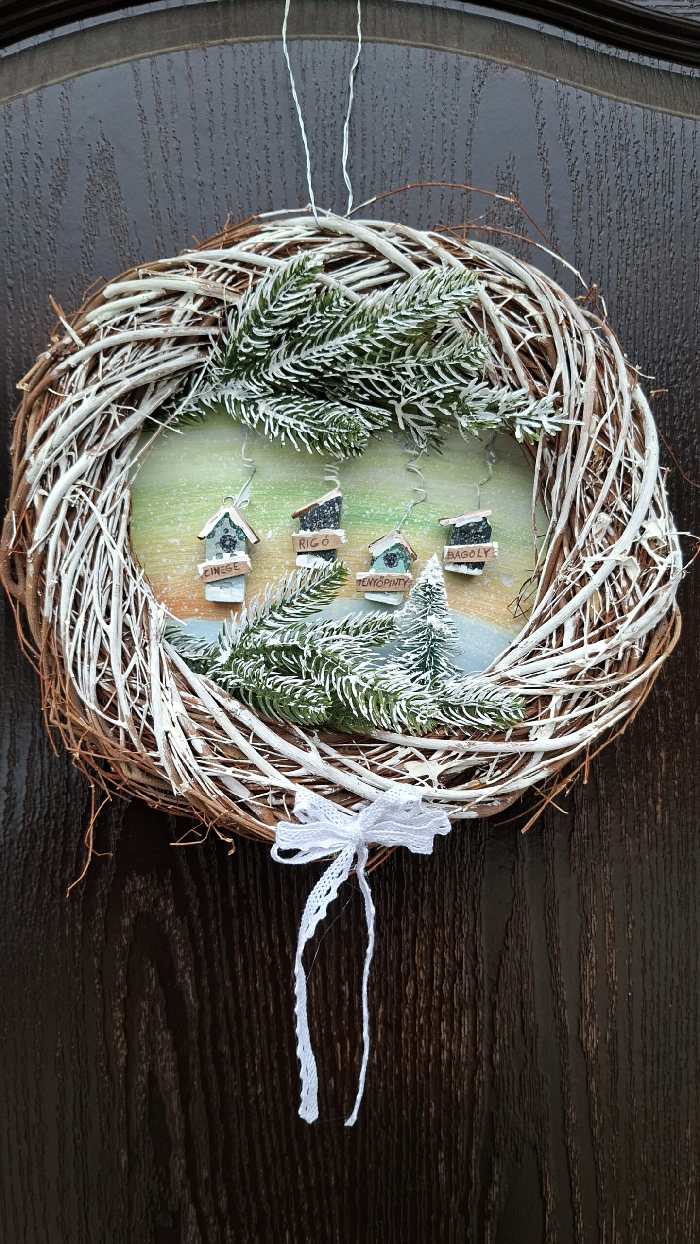 Karácsonyi kopogtató, madáretetővel, különleges téli téma, most az ajtódon díszeleghet.
